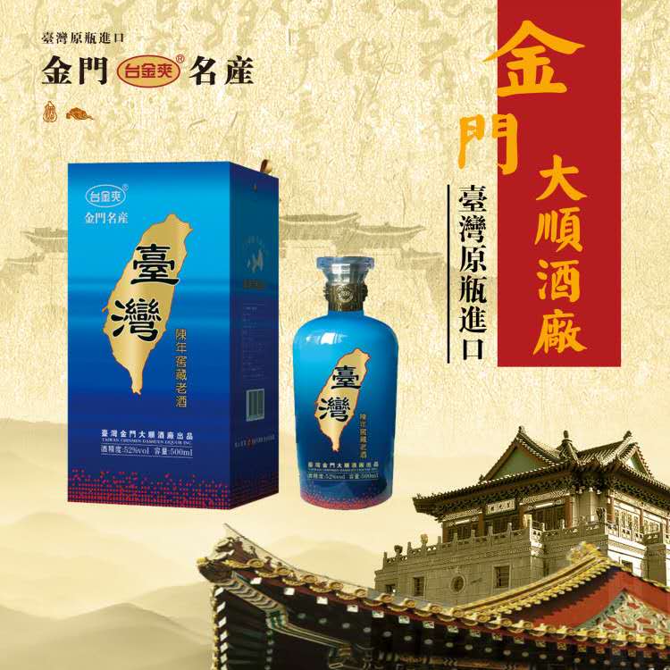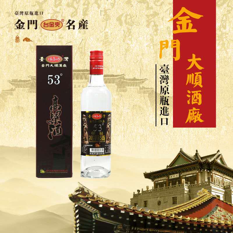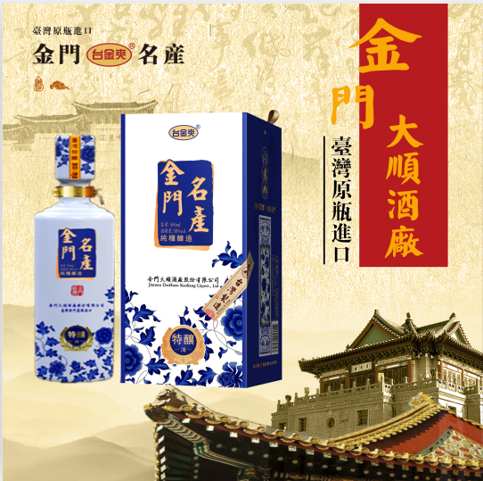 金門大順酒廠,座落于金門北緯24.5度,地處海隅,濱大陸,得天獨厚的地理,使它擁有絕佳的水質(zhì)、空氣、氣候及原料的四大天然釀酒條件。金門大順酒廠的高粱酒釀造是利用金門特產(chǎn)『旱地高粱』、引用當?shù)厮|(zhì)甘甜的泉水、金門潔凈的空氣與氣候條件,并承襲傳統(tǒng)古法之釀酒技術,加上獨家的釀酒專業(yè)技術經(jīng)驗【三離二鍋一翻】的發(fā)酵釀酒工藝,經(jīng)掐頭去尾后入庫,去蕪存菁。而造就出金門大順酒廠的高粱酒特色「清澈透明、質(zhì)地純凈、芳香濃郁」之一系列高粱酒。金門大順酒廠制酒承襲著金門得天獨厚的地理環(huán)境,加上三代流傳之古法醇釀技技術,結(jié)合經(jīng)驗與現(xiàn)代化生產(chǎn),釀出風味獨特,香、醇、甘、冽的【臺島】【臺金爽】【牛樟芝高粱酒】【龍騰鳳舞】【紅雙十】【陳高吶】【臺灣小酒】等多樣系列產(chǎn)品。真實原味、清香散發(fā),甘冽醇厚的絕佳風味。